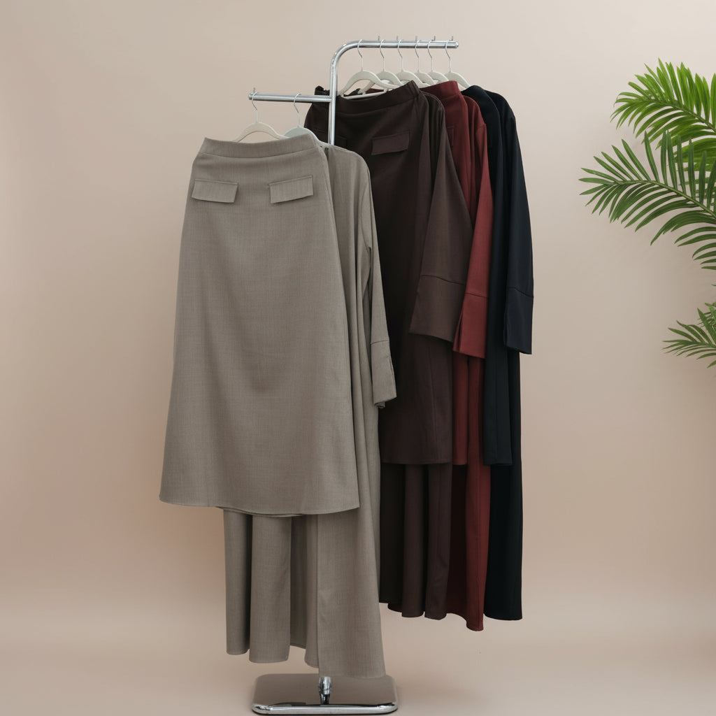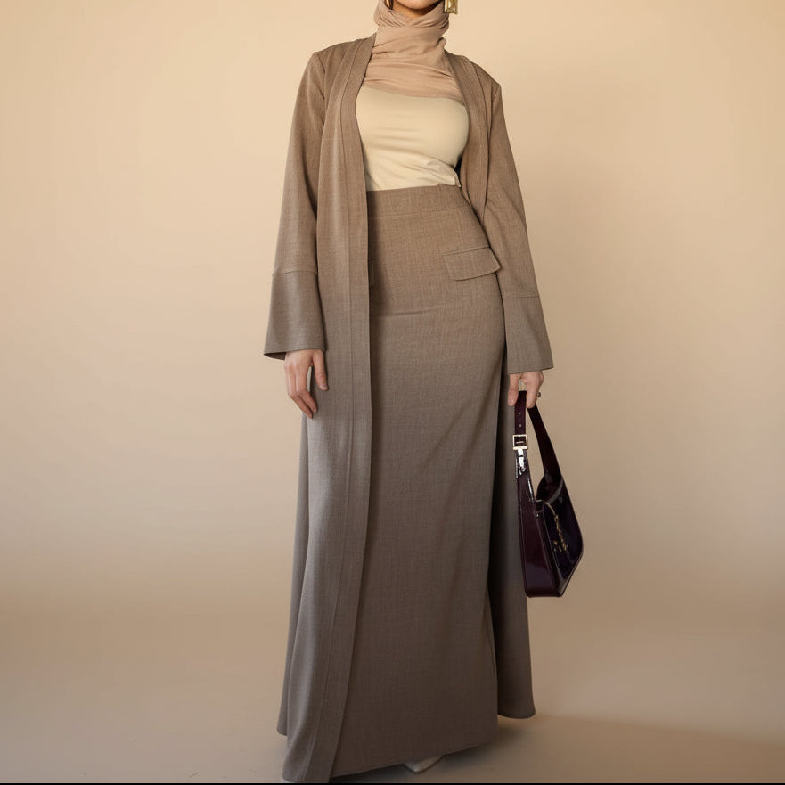 انطلقي في أناقةٍ سلسة مع طقم ليان المكون من قطعتين، عباية مفتوحة وتنورة ماكسي. هذا الطقم الأنيق مثاليٌّ لفصل الربيع والصيف والخريف، مصنوع من مادة نايلون خفيفة الوزن، ليضمن لكِ راحةً وانسيابيةً طوال اليوم. صُمم الطقم للمرأة العصرية، ويتألف من تنورة ماكسي أنيقة مع عباية مفتوحة أنيقة مزودة بجيوب عملية، وهي قطعة أساسية في إطلالاتكِ اليومية العملية. متوفر بأربعة ألوان ومقاسات متنوعة. S-XLهذا الزي المنسق هو خيارك المفضل للحصول على مظهر متواضع ومتطور.