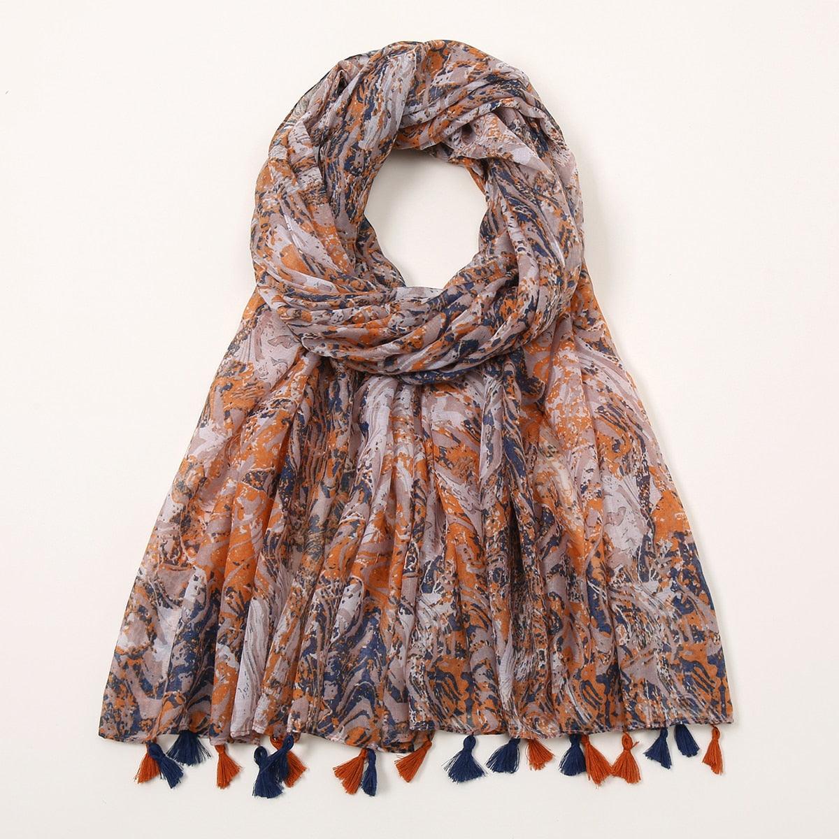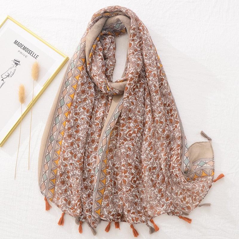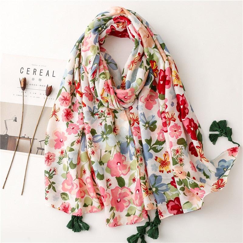 This Fresh Floral Tassel Scarf is perfect for completing any outfit. Crafted from Cotton /Viscose, it features an eye-catching floral design and delicate tassels. Its 175 cm length and 90 cm width make it perfect for women in any season. Soft to the touch and lightweight at just 95g, you'll look stylish and fashionable each time you wear it.