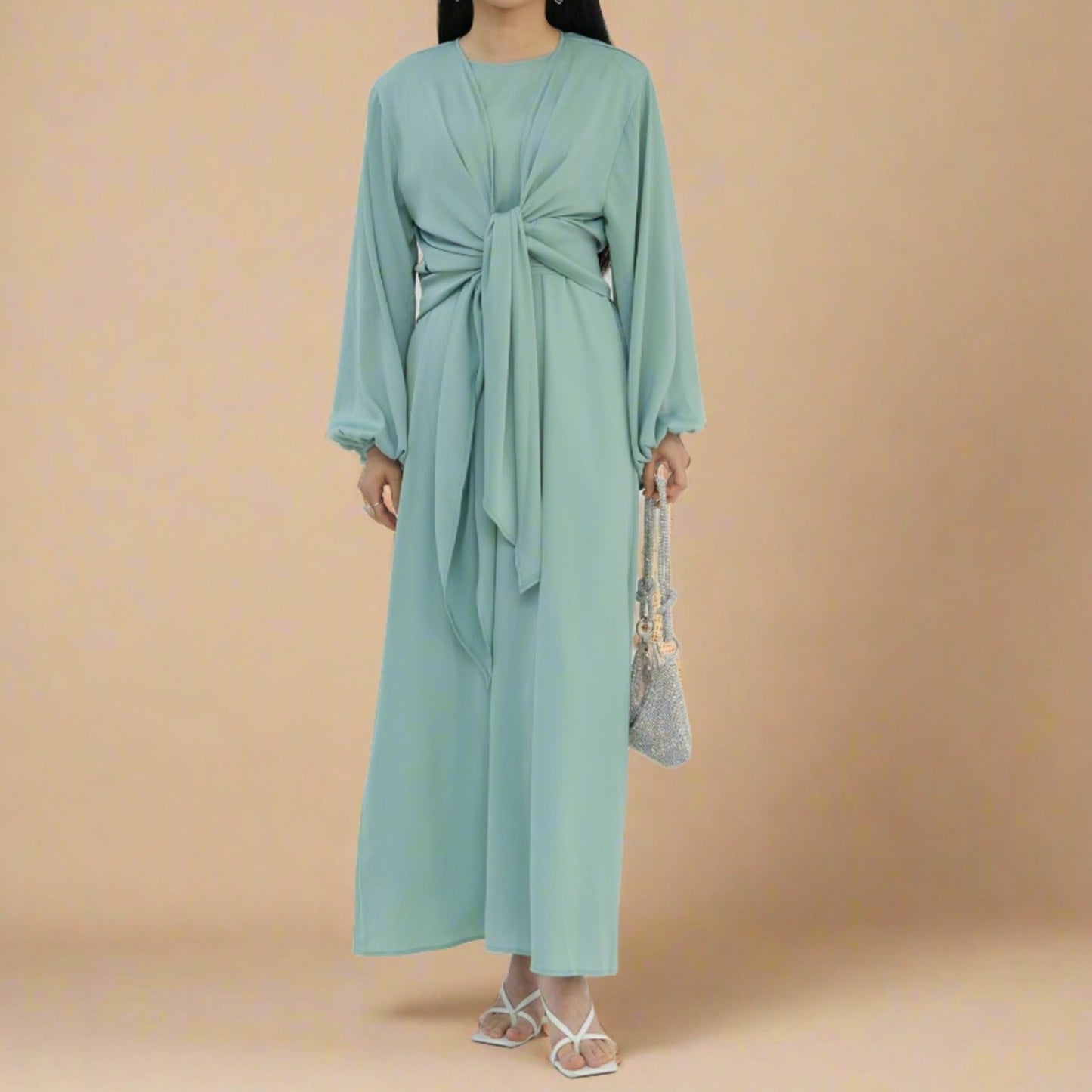 Introducing the stunning Graceful Duo - a 2 PC abaya set with a wrap top made of luxurious wrinkle satin. The set includes a versatile top that can be worn as a traditional top or tied as a knot and a detachable wrap belt. Available in sizes S to XXL, this set is both elegant and functional.