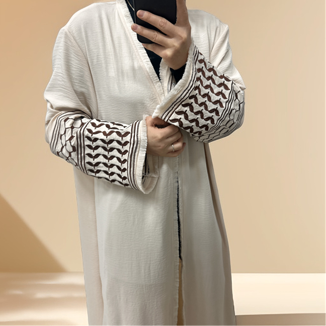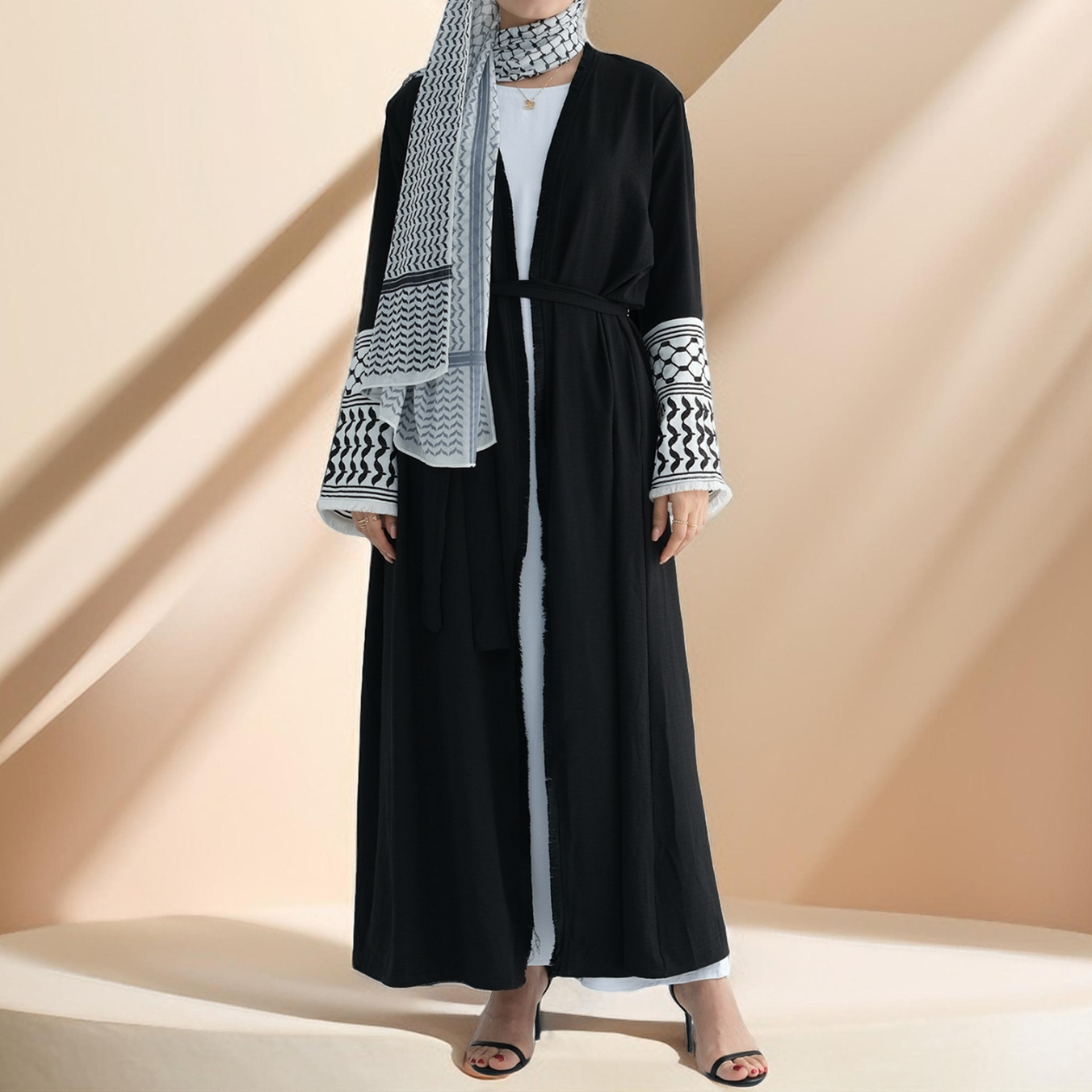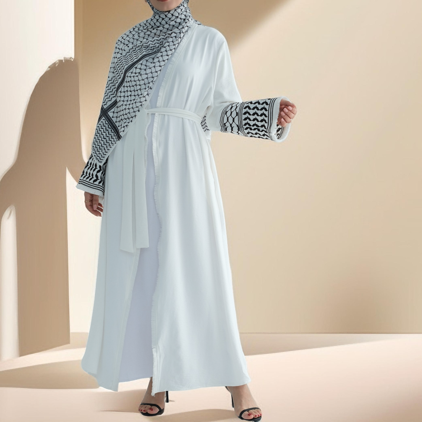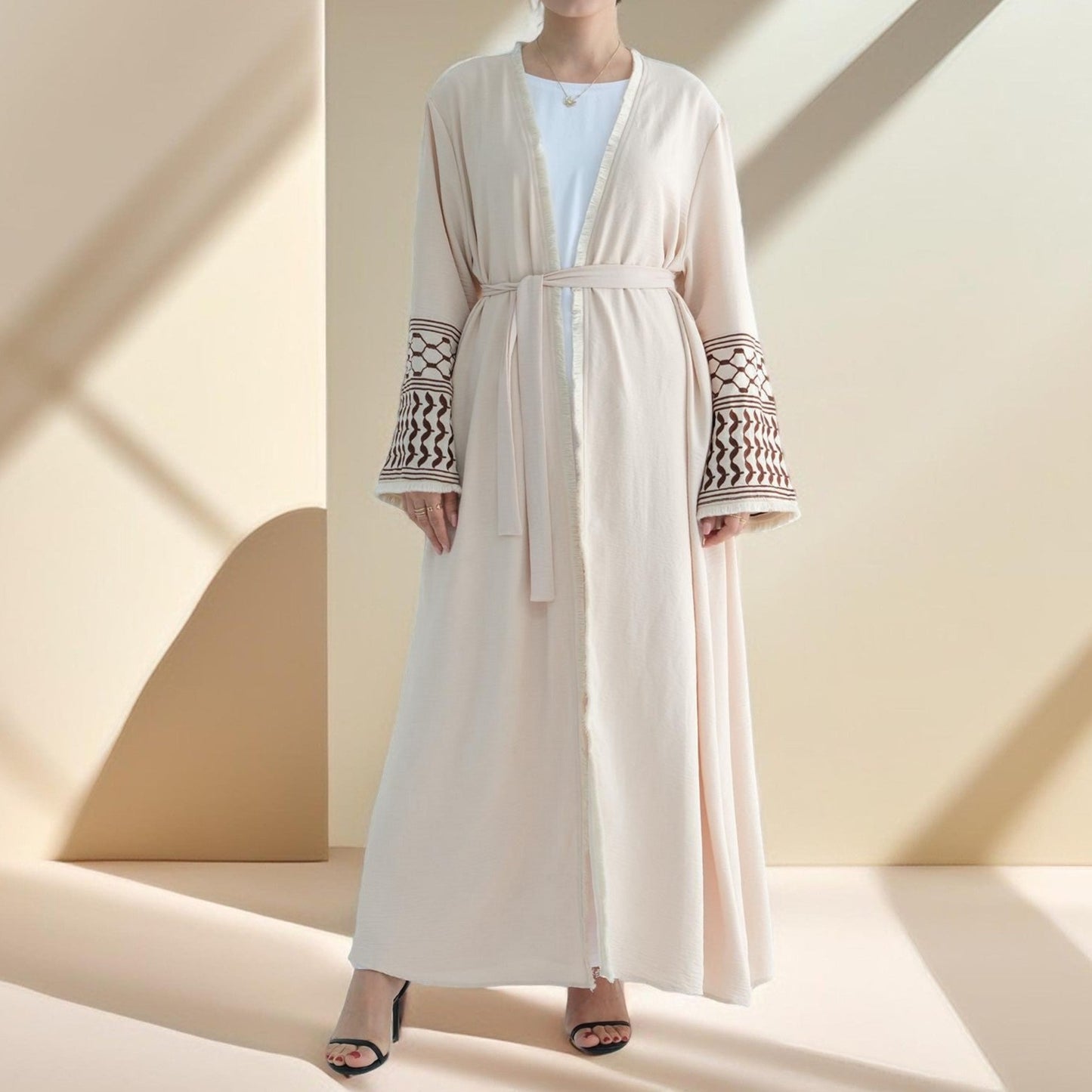 Experience elegance and comfort with the Palestine Ethereal Abaya, available in S-XXL sizes. Its flowing silhouette and delicate fabric evoke an ethereal aura, reflecting the resilience and beauty of Palestinian heritage. This open abaya features a stunning embroidered design on wrinkle-resistant polyester fabric, complete with tassels and convenient side pockets. Available in classic black, apricot and crisp white, this abaya is the perfect addition to your wardrobe.