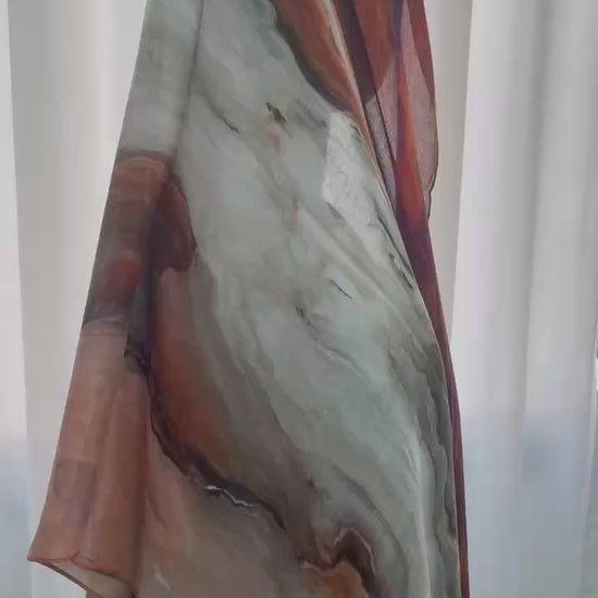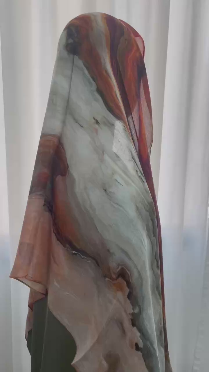 Dompel jezelf onder in de aardse schoonheid van onze Canyon Flow Modal Hijab. Net als de gelaagde texturen van eeuwenoude canyonwanden, uitgehouwen door de tijd, heeft deze hijab een betoverende mix van warme bruintinten, rijke roesttinten en zachte crèmes die samenvloeien in betoverende patronen. Gemaakt van onze kenmerkende 100% modal, biedt hij een zachte touch en een prachtige drapering, die doet denken aan gladde, koele steen. Omarm de natuurlijke kunstzinnigheid van de aarde en laat deze hijab een vleugje geaarde elegantie toevoegen aan je stijl.