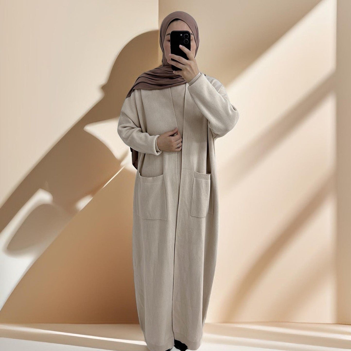 Elevate your daily wardrobe with our stylish Open Abaya and Inner Dress Set. This versatile ensemble, perfect for Autumn, Winter, and Spring, combines comfort and elegance. The open abaya, crafted from a soft Wool and Polyester blend, features practical pockets and a contemporary design. The solid-color, sleeveless inner dress offers a minimalist look. Wear the set together for a complete outfit or purchase the cardigan and inner dress separately. Available in four classic colours (Coffee, Black, Khaki, and Apricot) and two sizes (S/M and L/XL), this set is the perfect addition to your modest wardrobe.