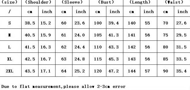 - Please check the size chart carefully before you buy the item. This is the best way to ensure that you get the right size. The size chart will typically list the measurements for the garment, such as the bust, waist,sleeve and length measurements. You can compare these measurements to your own measurements to find the right size.