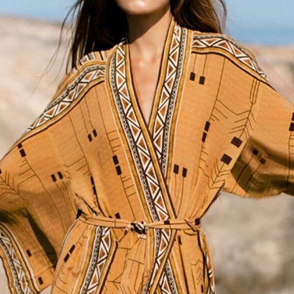 This Printed Long Sleeve Bohemian Kimono is designed with a youthful style and print, crafted from a blend of Cotton and Rayon fabric. For a perfect fit, please refer to the sizing details specified.
