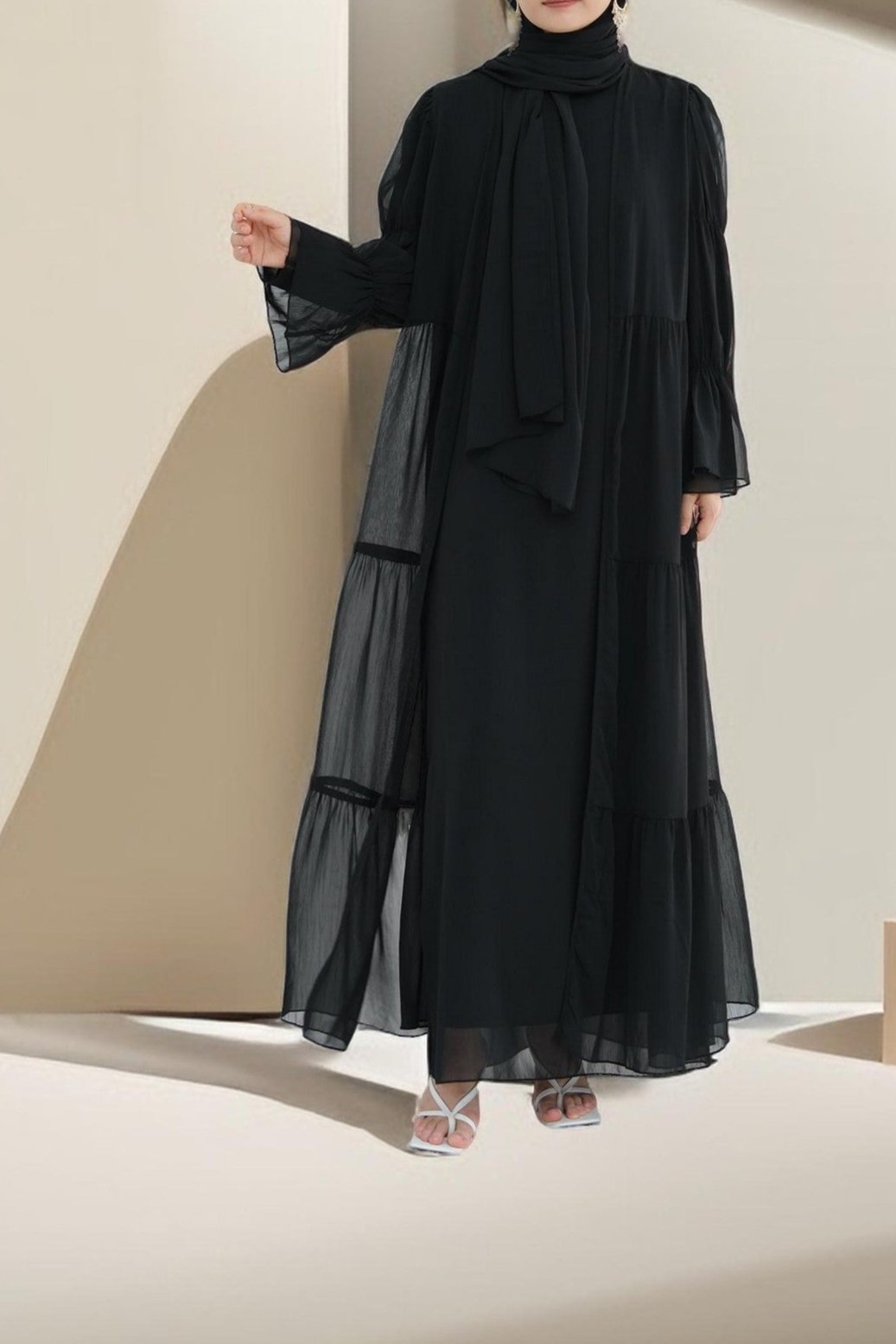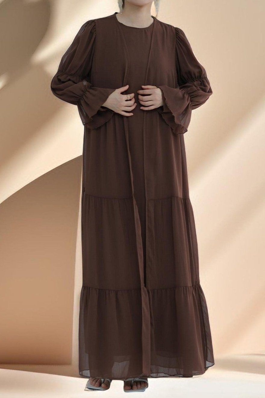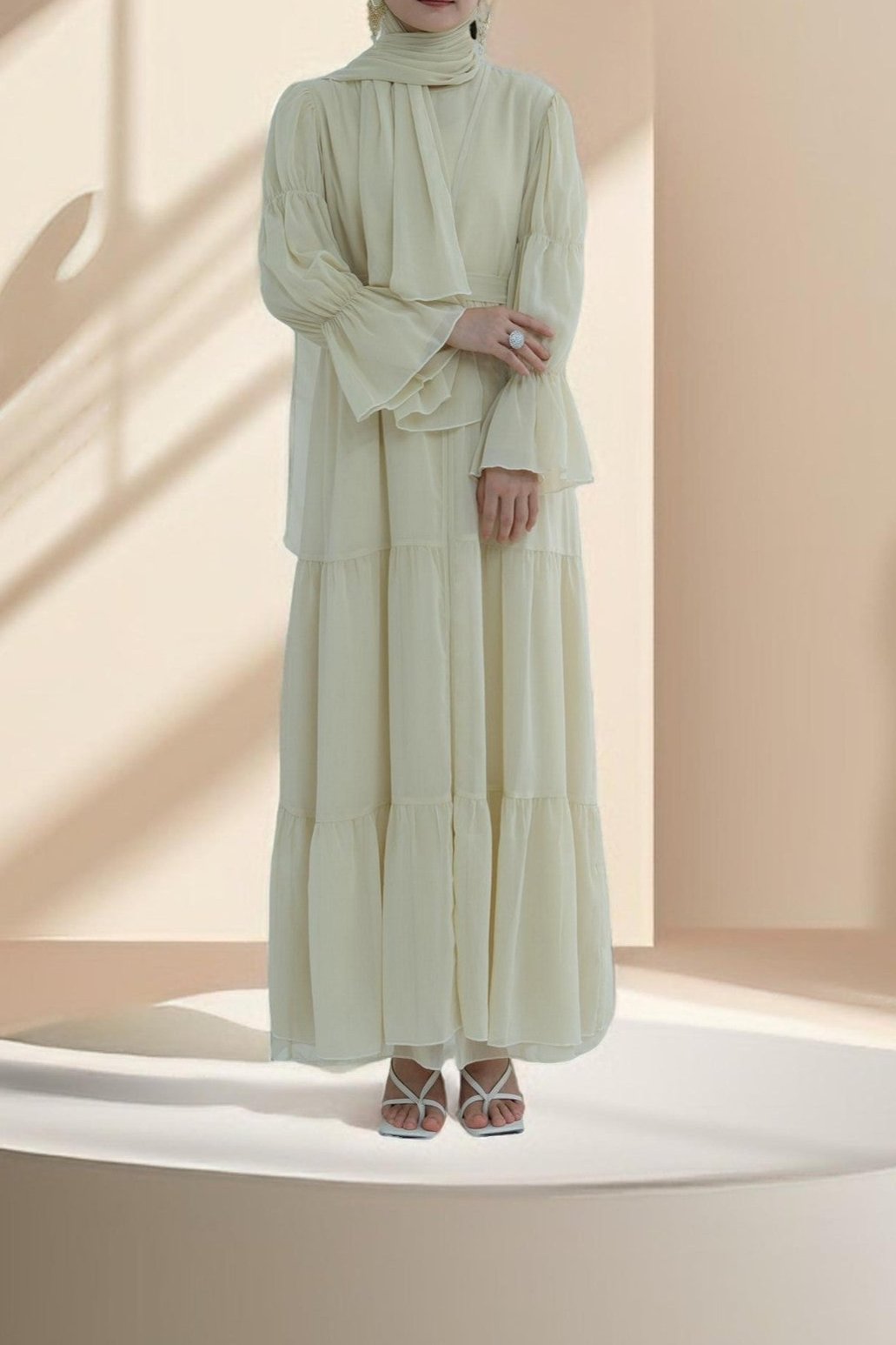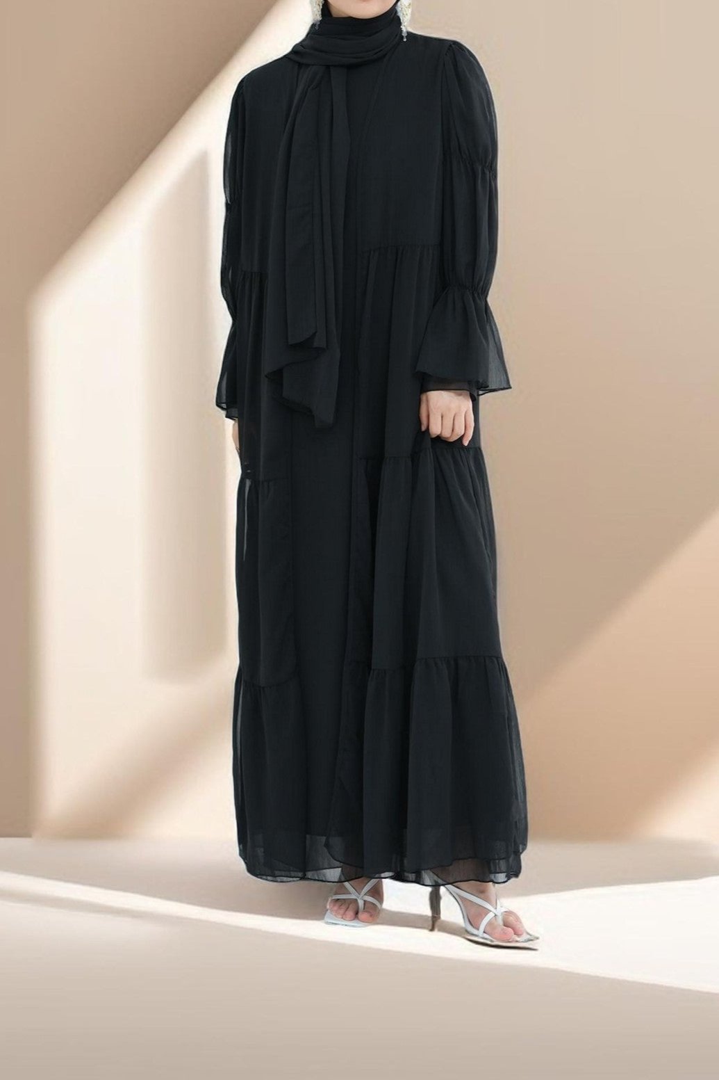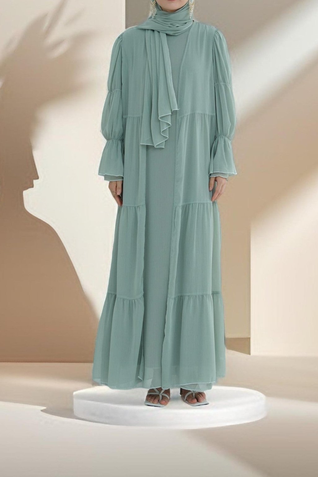 Indulge in the versatile and sophisticated design of this Elegant Chiffon 2-Piece Abaya Set. With 6 stunning colors and sizes ranging from S-XXL, this set features a flowy and boho-inspired tiered abaya, complete with ruffled sleeves and a detachable belt. Dress it up or down for any occasion and make a statement with its exclusive elegance. Includes outer abaya and slip dress.