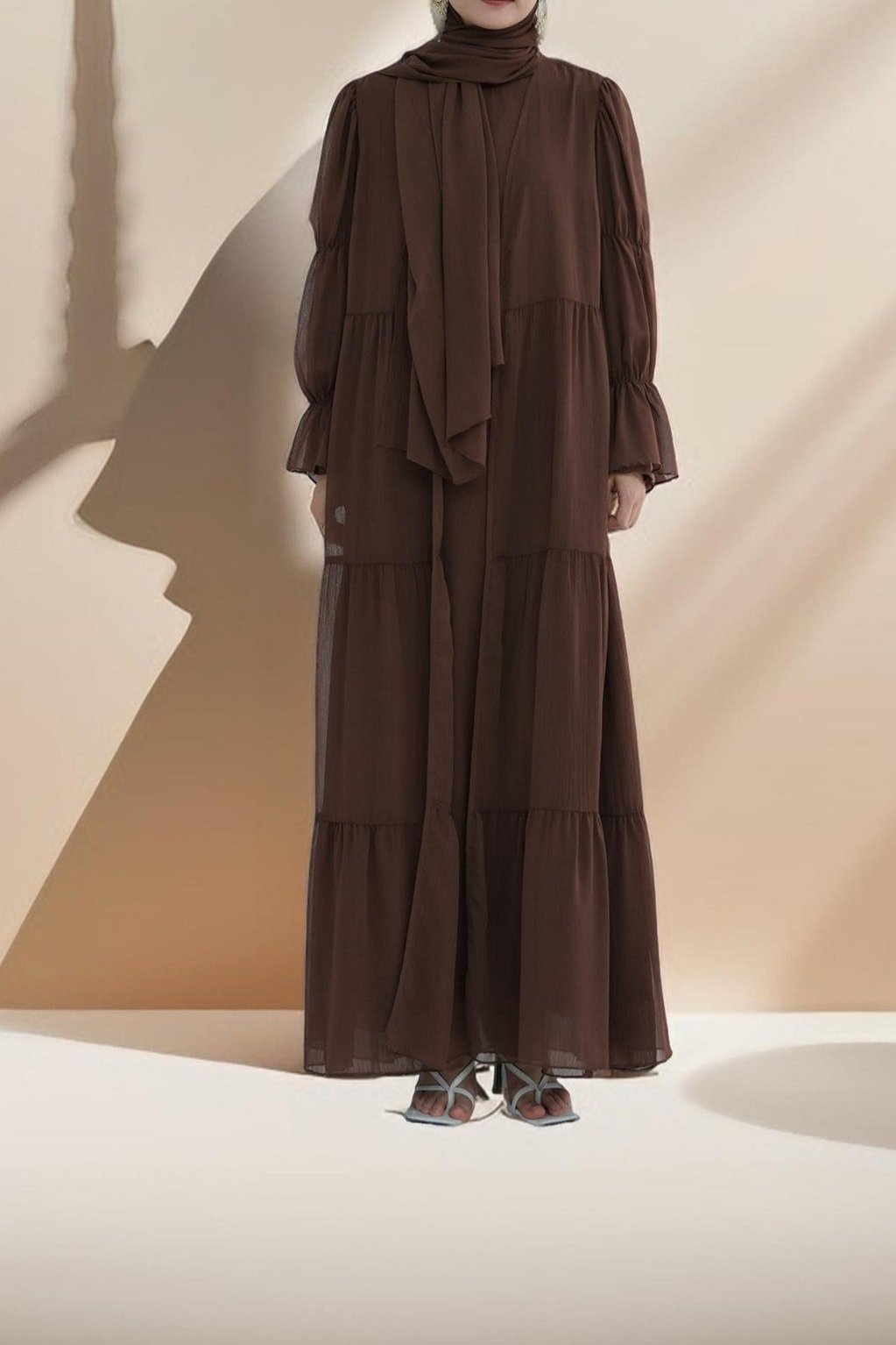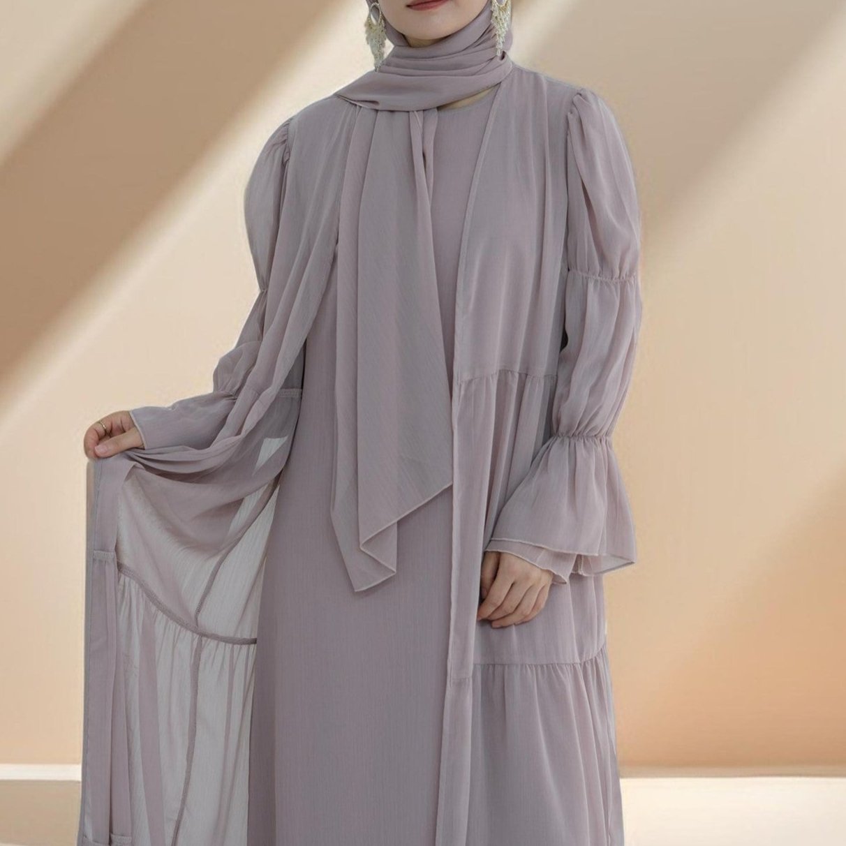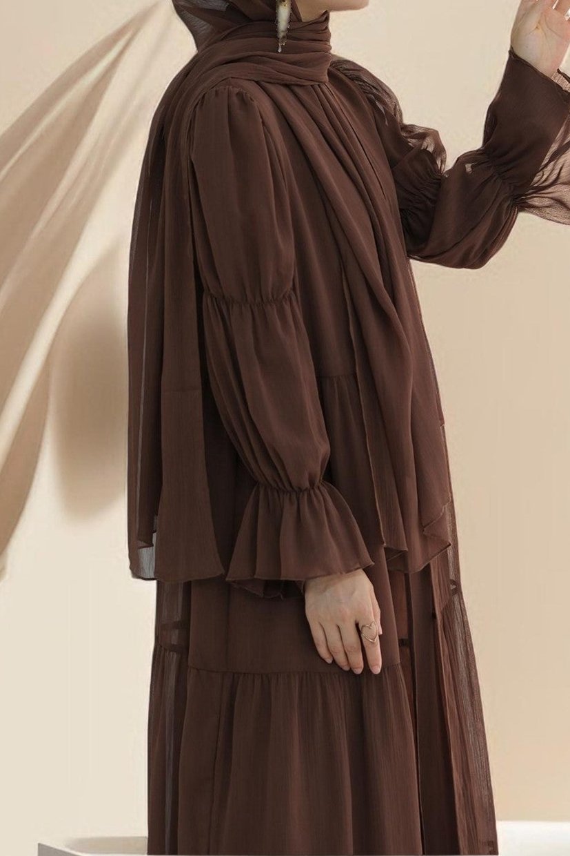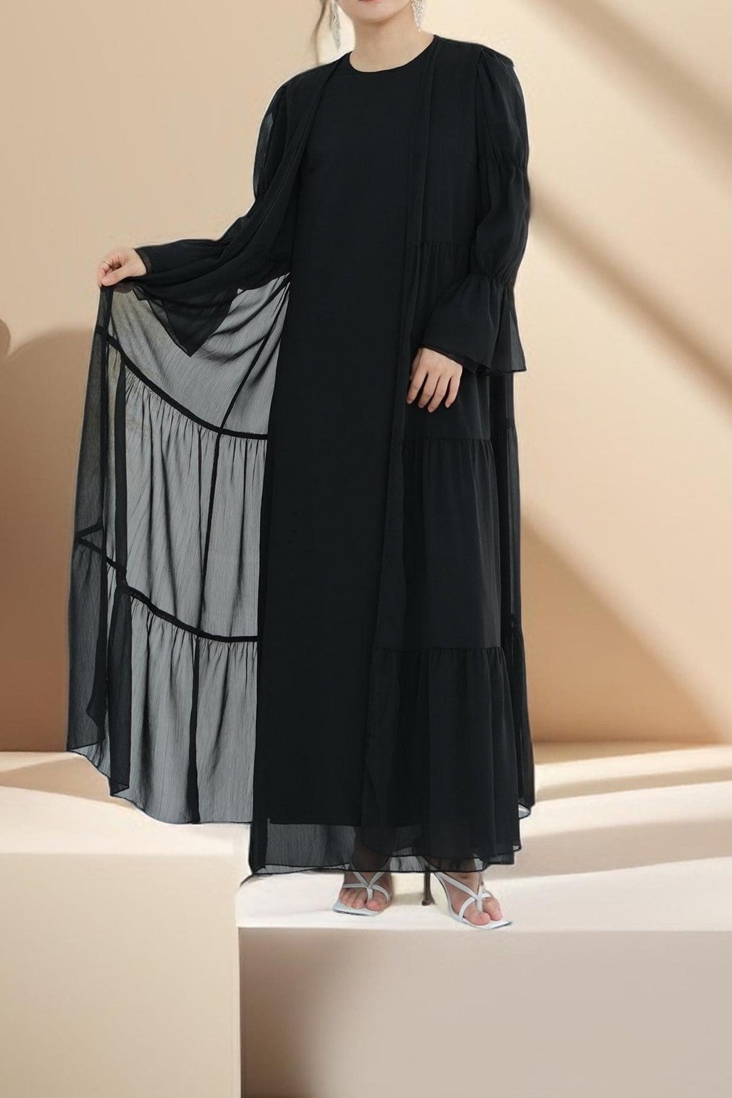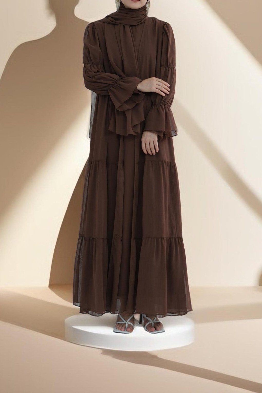 Indulge in the versatile and sophisticated design of this Elegant Chiffon 2-Piece Abaya Set. With 6 stunning colors and sizes ranging from S-XXL, this set features a flowy and boho-inspired tiered abaya, complete with ruffled sleeves and a detachable belt. Dress it up or down for any occasion and make a statement with its exclusive elegance. Includes outer abaya and slip dress.