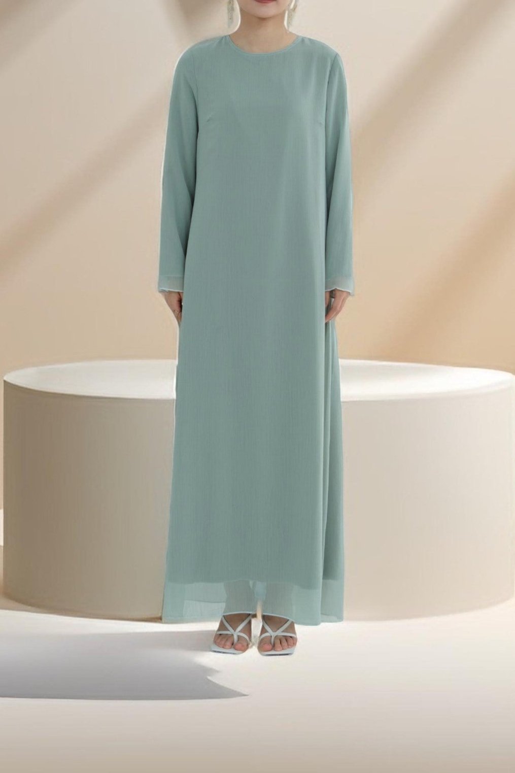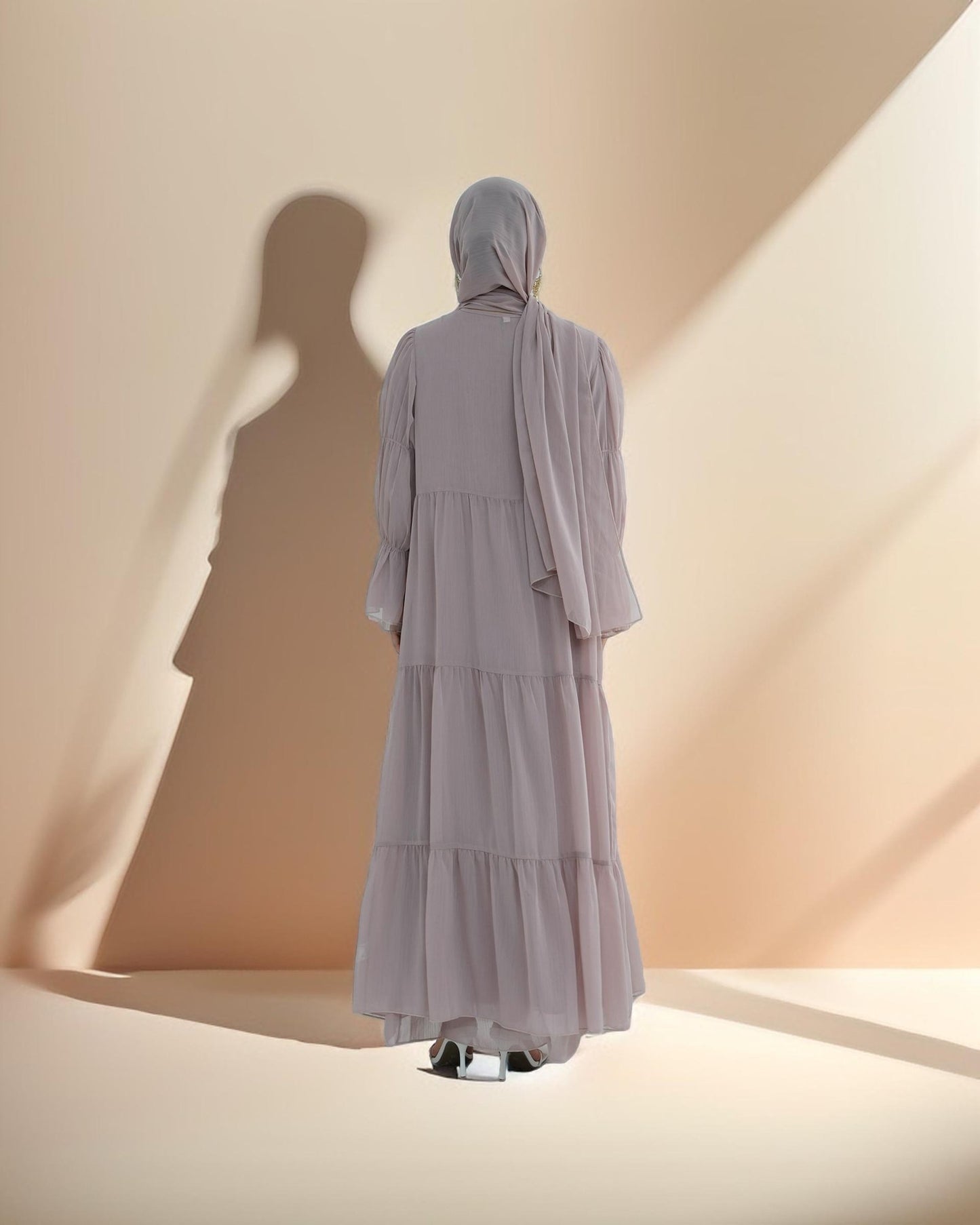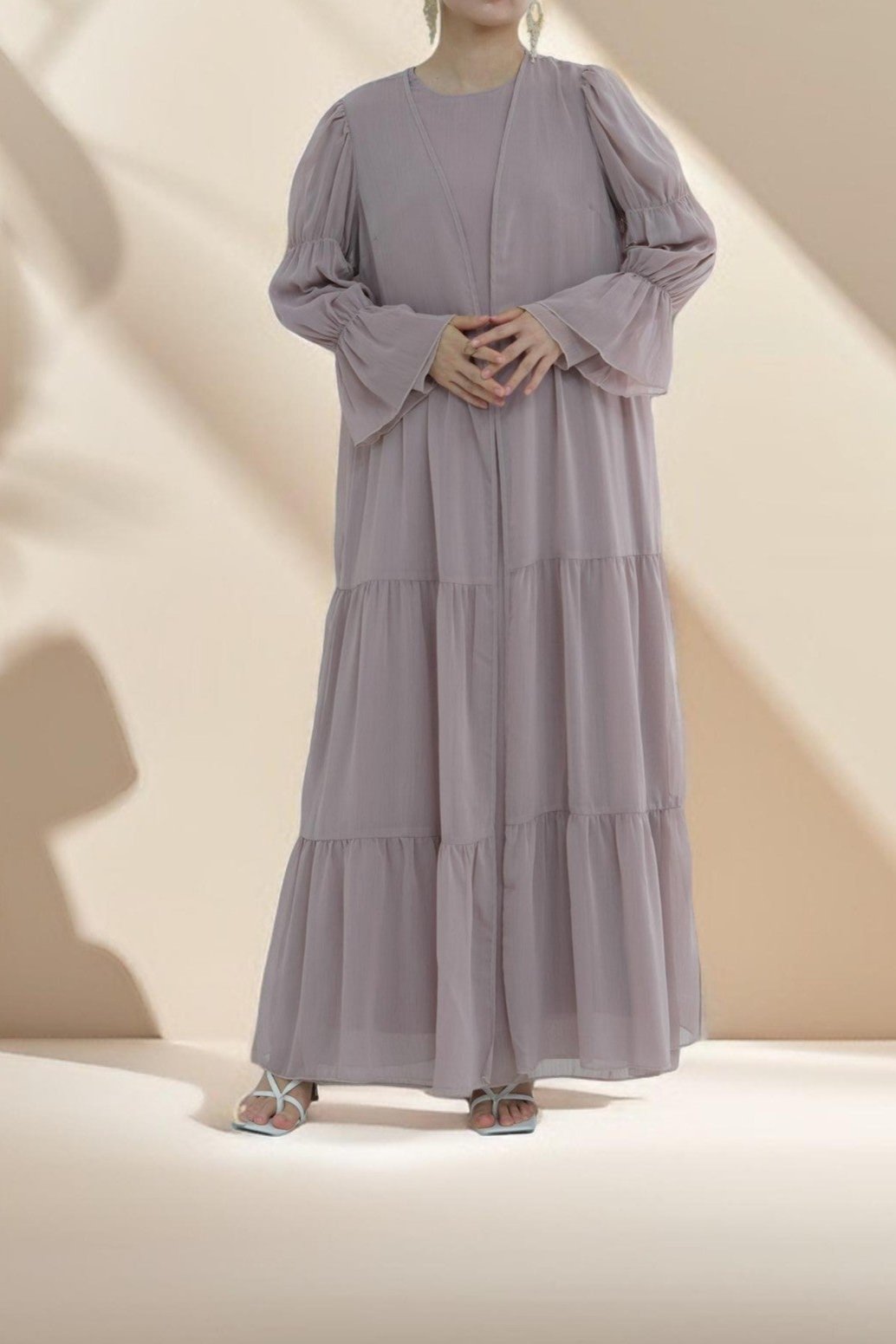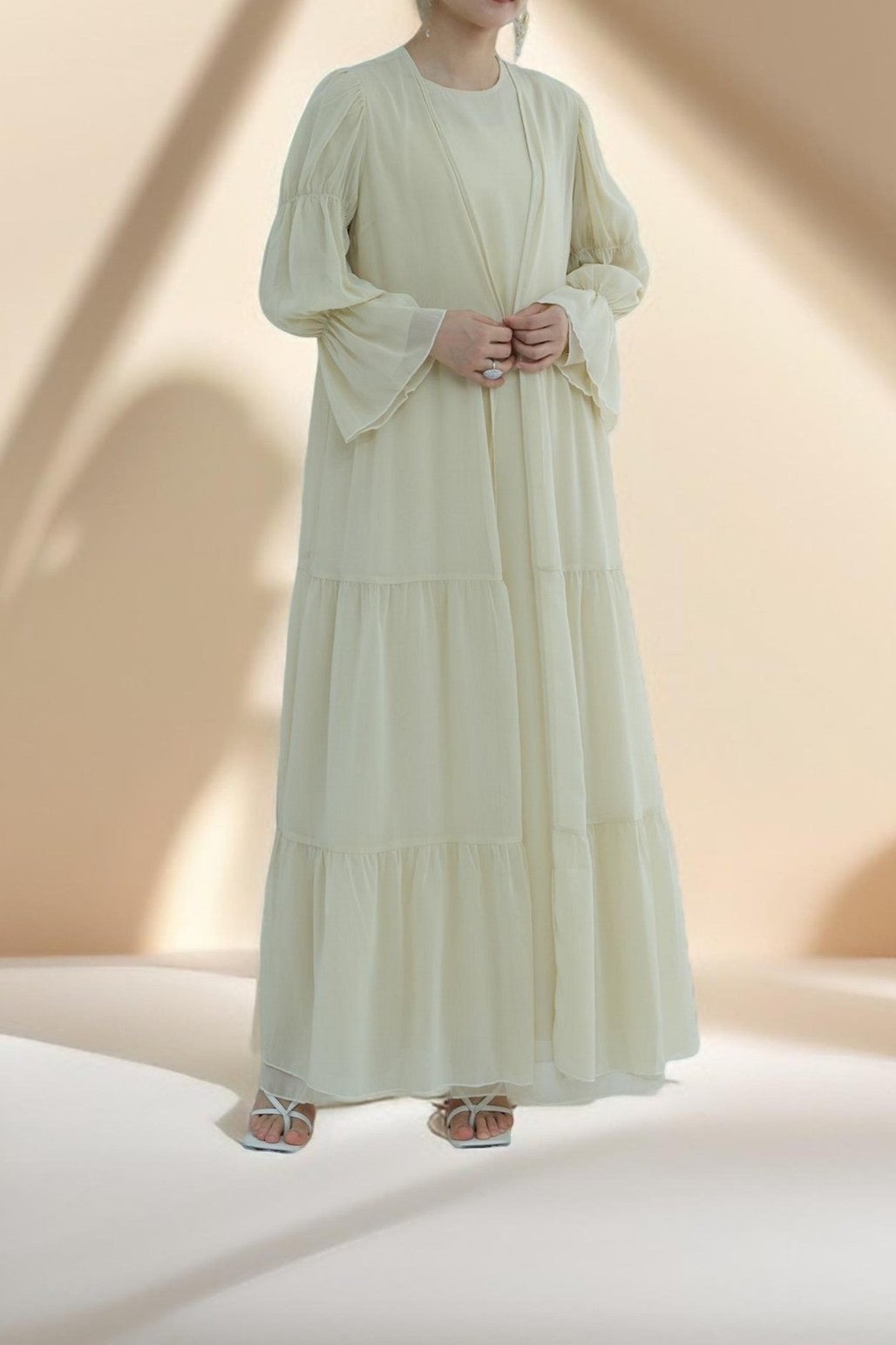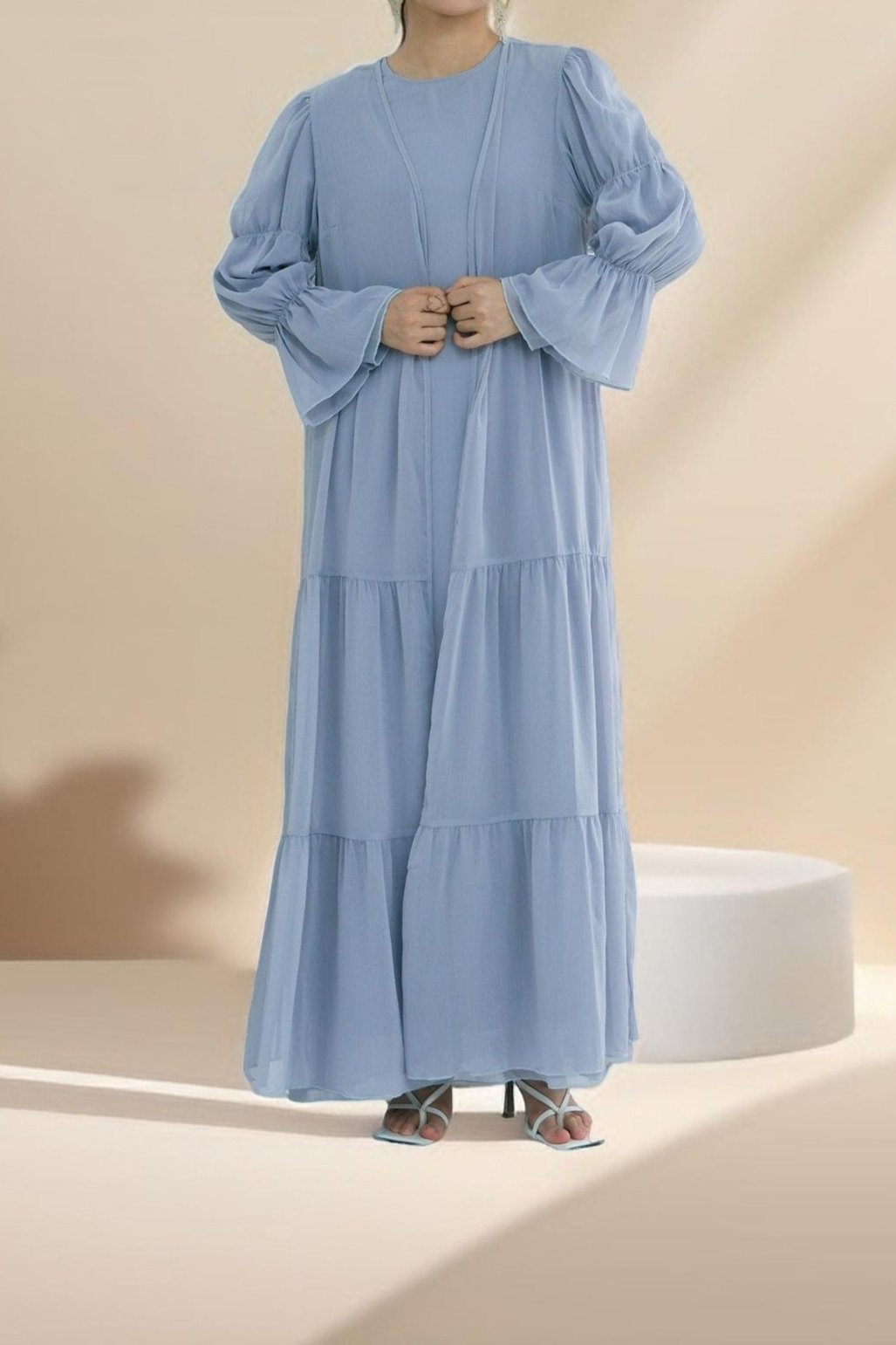 Indulge in the versatile and sophisticated design of this Elegant Chiffon 2-Piece Abaya Set. With 6 stunning colors and sizes ranging from S-XXL, this set features a flowy and boho-inspired tiered abaya, complete with ruffled sleeves and a detachable belt. Dress it up or down for any occasion and make a statement with its exclusive elegance. Includes outer abaya and slip dress.