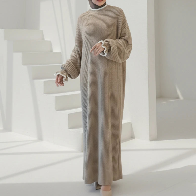 Upplev den perfekta blandningen av värme, komfort och elegant stil den här säsongen med den ultimata mjuka ribbstickade maxitröjan för kvinnor. Denna långärmade maxiklänning är tillverkad av ett mysigt, stickat polyestermaterial och erbjuder mjuk, andningsbar komfort utan att offra hållbarhet. Dess avslappnade, raka silhuett och eleganta höghalsade (eller polotröja) design ger både elegans och värme, vilket gör den till en perfekt vinterklänning som passar för olika tillfällen, inklusive dess avsedda användning i Closed Abaya Design. Den ribbstickade texturen ger en touch av sofistikering, och de elastiska ärmarna säkerställer en bekväm och åtsittande passform i ärmsluten. Detta slitstarka, lättskötta plagg finns i fyra livfulla färgalternativ, vilket gör den till ditt nya val för ökad komfort.